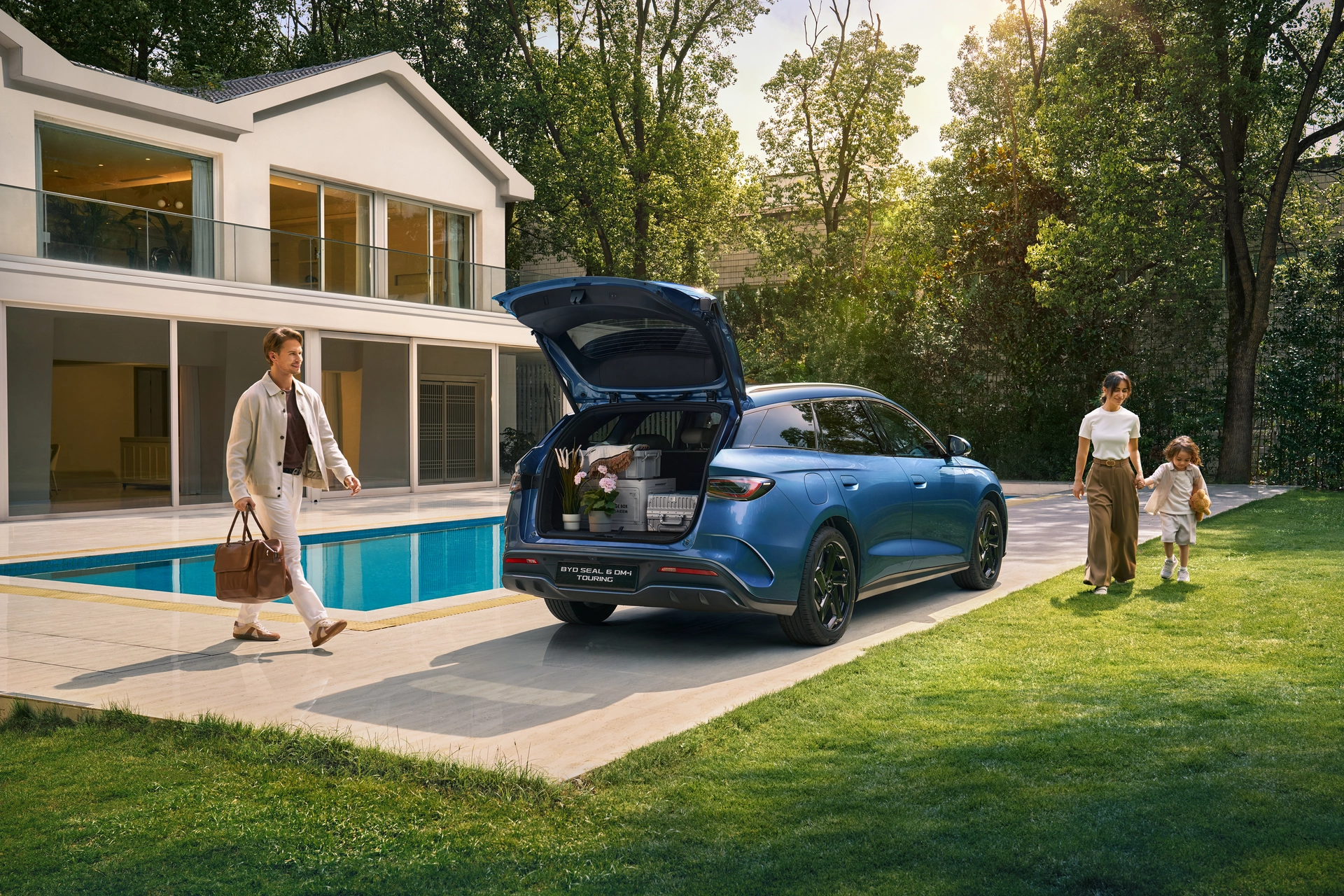 The SEAL 6 DM-i TOURING combines BYD’s signature design with a practical and spacious interior. The front is defined by elegant ocean-inspired lines and sharper lower elements, creating a modern and dynamic look.